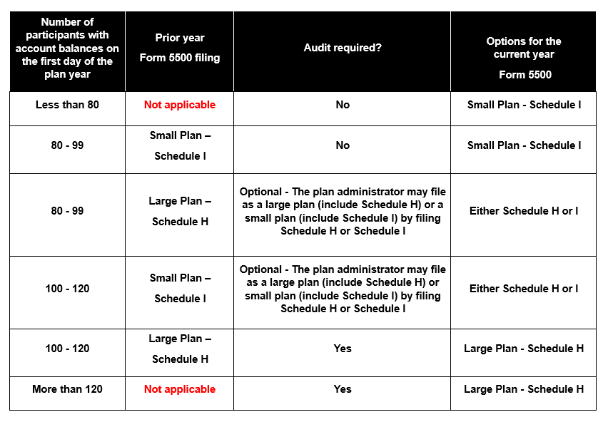 Once the proper participant count has been determined, the plan administrator may evaluate whether or not an audit is required. The following table illustrates most possibilities: